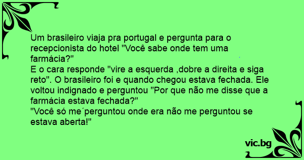 E o cara responde "vire a esquerda ,dobre a direita e siga reto". O brasileiro foi e quando chegou estava fechada. Ele voltou indignado e perguntou "Por que não me disse que a farmácia estava fechada?"