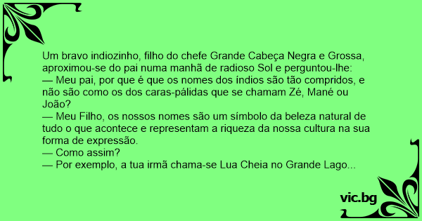 — Meu pai, por que é que os nomes dos índios são tão compridos, e não são como os dos caras-pálidas que se chamam Zé, Mané ou João?