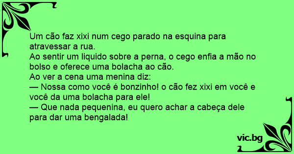 Ao sentir um liquido sobre a perna, o cego enfia a mão no bolso e oferece uma bolacha ao cão.