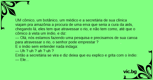 UM cômico, um botânico, um médico e a secretária de sua clínica viajam pra amazônia a procura de uma erva que seria a cura da aids, chegando lá, eles tem que atravessar o rio, e não tem como, até que o cômico à vista um índio, e diz: