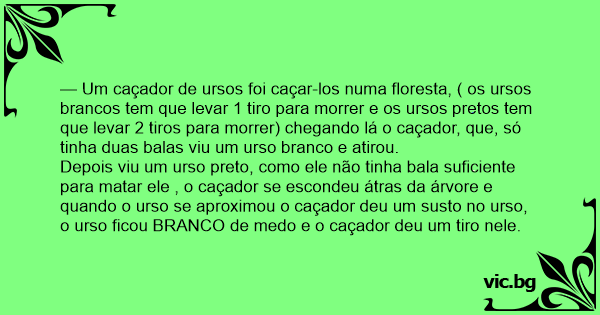 — Um caçador de ursos foi caçar-los numa floresta, ( os ursos brancos tem que levar 1 tiro para morrer e os ursos pretos tem que levar 2 tiros para morrer) chegando lá o caçador, que, só tinha duas balas viu um urso branco e atirou.
