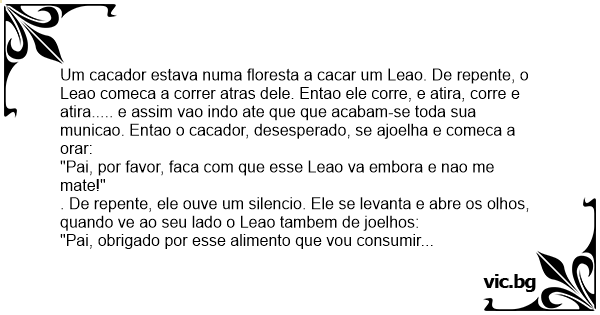 Um cacador estava numa floresta a cacar um Leao. De repente, o Leao comeca a correr atras dele. Entao ele corre, e atira, corre e atira..... e assim vao indo ate que que acabam-se toda sua municao. Entao o cacador, desesperado, se ajoelha e comeca a orar: