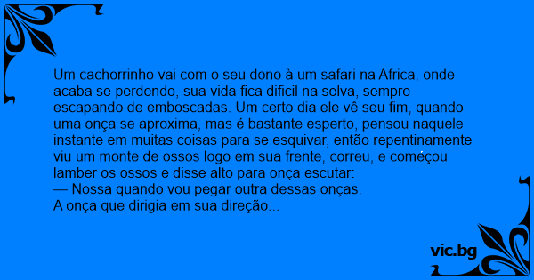 Um cachorrinho vai com o seu dono à um safari na Africa, onde acaba se perdendo, sua vida fiса dificil na selva, sempre escapando de emboscadas. Um certo dia ele vê seu fim, quando uma onça se aproxima, mas é bastante esperto, pensou naquele instante em muitas coisas para se esquivar, então repentinamente viu um monte de ossos logo em sua frente, correu, e começou lamber os ossos e disse alto para onça escutar: