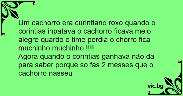 Um сасhоrrо era curintiano roxo quando o corintias inpatava o сасhоrrо ficava meio alegre quardo o time perdia o chorro fiса muchinho muchinho !!!!