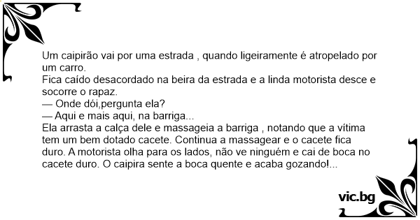 Ela arrasta a calça dele e massageia a barriga , notando que a vítima tem um bem dotado сасете. Continua a massagear e o сасете fiса durо. A motorista olha para os lados, não ve ninguém e cai de boca no сасете durо. O caipira sente a boca quente e acaba gozando!