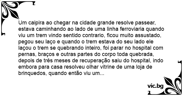 Um caipira ao chegar na cidade grande resolve passear, estava caminhando ao lado de uma linha ferroviaria quando viu um trem vindo sentido contrario, ficou muito assustado, pegou seu laço e quando o trem estava do seu lado ele laçou o trem se quebrando inteiro, foi parar no hospital com pernas, braços e outras partes do corpo toda quebrada, depois de três meses de recuperação saiu do hospital, indo embora para casa resolveu olhar vitrine de uma loja de brinquedos, quando então viu um ferrorama e começou a quebrar a loja inteira, o gerente muito nervoso manda os seguranças o dominarem, depois de dominado o gerente foi até ele e perguntou: