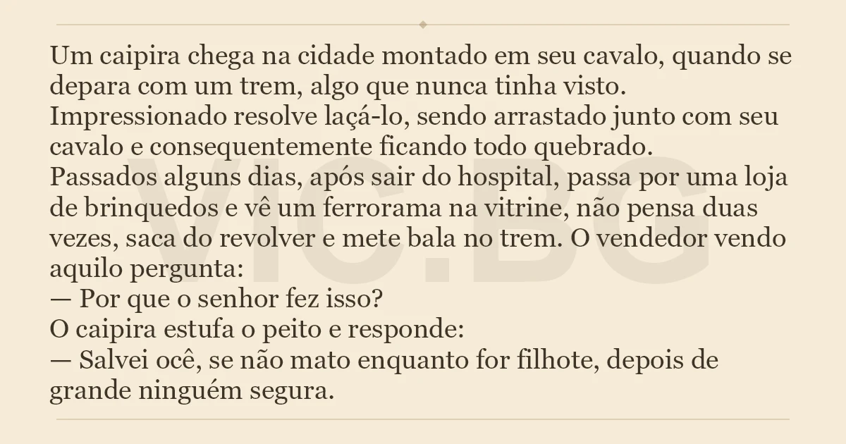 Um caipira chega na cidade montado em seu cavalo, quando se depara com um trem, algo que nunca tinha visto. Impressionado resolve laçá-lo, sendo arrastado junto com seu cavalo e consequentemente ficando todo quebrado. Passados alguns dias, após sair do hospital, passa por uma loja de brinquedos e vê um ferrorama na vitrine, não pensa duas vezes, saca do revolver e mete bala no trem. O vendedor vendo aquilo pergunta: — Por que o senhor fez isso? O caipira estufa o peito e responde: — Salvei ocê, se não mato enquanto for filhote, depois de grande ninguém segura.