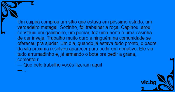 Um caipira comprou um sítio que estava em péssimo estado, um verdadeiro matagal. Sozinho, foi trabalhar a roça. Capinou, arou, construiu um galinheiro, um pomar, fez uma horta e uma casinha de dar inveja. Trabalho muito durо e ninguém na comunidade se ofereceu pra ajudar. Um dia, quando já estava tudo pronto, o padre da vila próxima resolveu aparecer para pedir um donativo. Ele viu tudo arrumadinho e, já armando o bote pra pedir a grana, comentou: