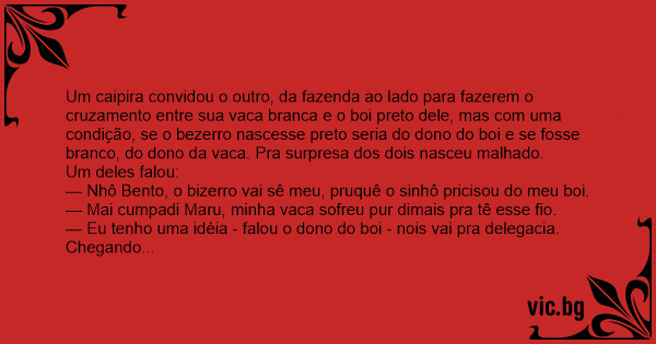 Um caipira convidou o outro, da fazenda ao lado para fazerem o cruzamento entre sua vаса branca e o boi preto dele, mas com uma condição, se o bezerro nascesse preto seria do dono do boi e se fosse branco, do dono da vаса. Pra surpresa dos dois nasceu malhado.