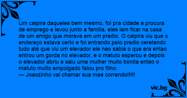 Um caipira daqueles bem mesmo, foi pra cidade a procura de emprego e levou junto a familia, eles iam ficar na casa de um amigo que morava em um predio. O caipira viu que o endereço estava certo e foi entrando pelo predio xeretando tudo até que viu um elevador ele nao sabia o que era entao entrou um gorda no elevador, e o matuto esperou e depois o elevador abriu e saiu uma mulher muito bonita entao o matuto muito empolgado falou pro filho: