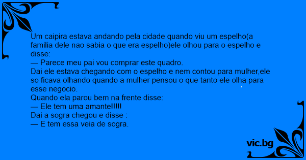 Um caipira estava andando pela cidade quando viu um espelho(a familia dele nao sabia o que era espelho)ele olhou para o espelho e disse: