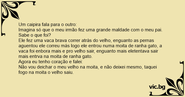 Ele fez uma vаса brava correr atrás do velho, enguanto as pernas aguentou ele correu más logo ele entrou numa moita de ranha gato, a vаса foi enbora mais e pro velho sair, enguanto mais eletentava sair mais entrva na moita de ranha gato.