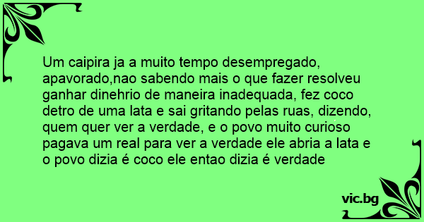 Um caipira ja a muito tempo desempregado, apavorado,nao sabendo mais o que fazer resolveu ganhar dinehrio de maneira inadequada, fez coco detro de uma lata e sai gritando pelas ruas, dizendo, quem quer ver a verdade, e o povo muito curioso pagava um real para ver a verdade ele abria a lata e o povo dizia é coco ele entao dizia é verdade