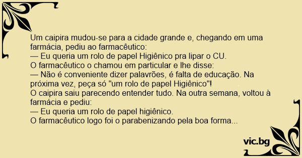 O caipira saiu parecendo entender tudo. Na outra semana, voltou à farmácia e pediu:
