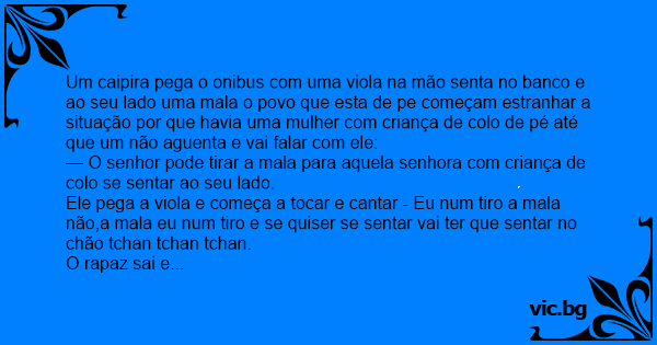 Um caipira pega o onibus com uma viola na mão senta no banco e ao seu lado uma mala o povo que esta de pe começam estranhar a situação por que havia uma mulher com criança de colo de pé até que um não aguenta e vai falar com ele: