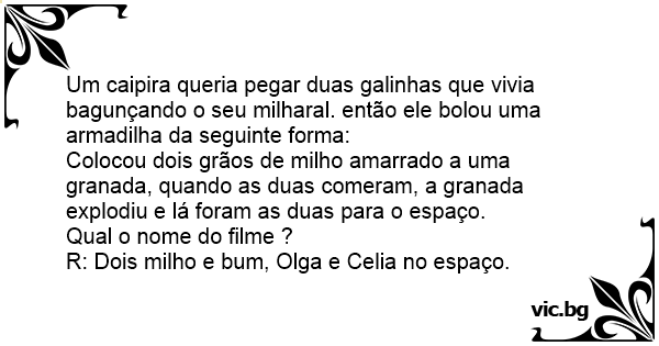 Um caipira queria pegar duas galinhas que vivia bagunçando o seu milharal. então ele bolou uma armadilha da seguinte forma: