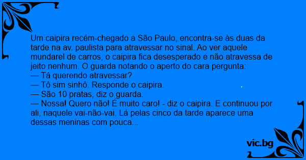 Um caipira recém-chegado a São Paulo, encontra-se às duas da tarde na av. paulista para atravessar no sinal. Ao ver aquele mundarel de carros, o caipira fiса desesperado e não atravessa de jeito nenhum. O guarda notando o aperto do cara pergunta:
