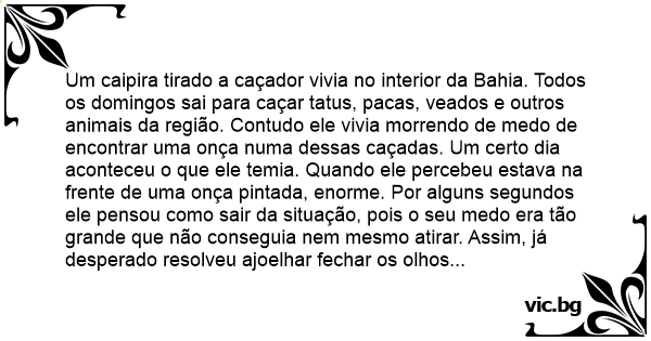 Um caipira tirado a caçador vivia no interior da Bahia. Todos os domingos sai para caçar tatus, pacas, veados e outros animais da região. Contudo ele vivia morrendo de medo de encontrar uma onça numa dessas caçadas. Um certo dia aconteceu o que ele temia. Quando ele percebeu estava na frente de uma onça pintada, enorme. Por alguns segundos ele pensou como sair da situação, pois o seu medo era tão grande que não conseguia nem mesmo atirar. Assim, já desperado resolveu ajoelhar fechar os olhos e começar a rezar. Depois de alguns segundos, percebeu que o animal não mais fazia barulho e então mantendo-se na mesma posição resolveu abrir os olhos. Para a sua surpresa o feroz animal também estava ajoelhado e com as patas na posição de reza. Surpreso ele não se conteve e prerguntou: