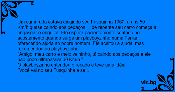 Um camarada estava dirigindo seu Fusquinha 1960, a uns 50 Km/h,quase caindo aos pedaços.... de repente seu carro começa a engasgar e enguiça. Ele espera pacientemente sentado no acostamento quando surge um playboyzinho numa Ferrari oferecendo ajuda ao pobre homem. Ele aceitou a ajuda, mas recomendou ao playboyzinho:
