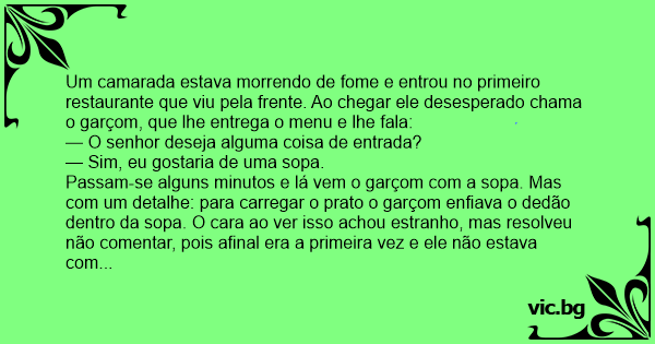 Passam-se alguns minutos e lá vem o garçom com a sopa. Mas com um detalhe: para carregar o prato o garçom enfiava o dedão dentro da sopa. O cara ao ver isso achou estranho, mas resolveu não comentar, pois afinal era a primeira vez e ele não estava com muito saco de reclamar.