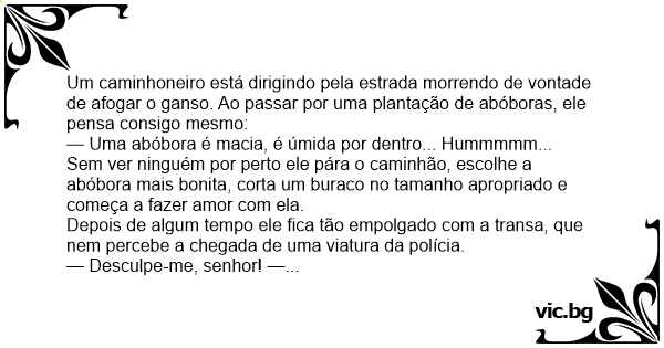 Um caminhoneiro está dirigindo pela estrada morrendo de vontade de afogar o ganso. Ao passar por uma plantação de abóboras, ele pensa consigo mesmo:
