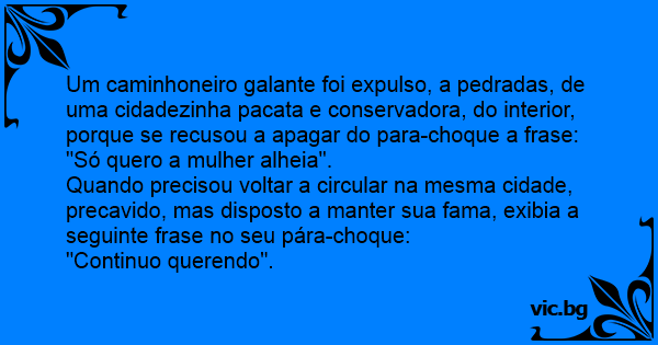 Um caminhoneiro galante foi expulso, a pedradas, de uma cidadezinha pacata e conservadora, do interior, porque se recusou a apagar do para-choque a frase: