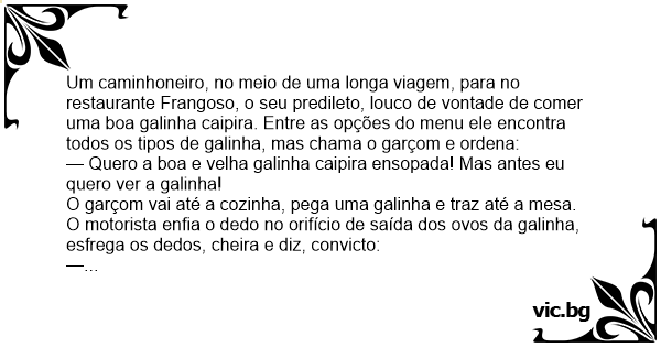 O garçom volta para a cozinha para mandar preparar a gаlinhа do freguês quando um bêbado que estava esparramado na mesa ao lado se levanta, vai até a mesa do motorista, baixa as calças e implora: