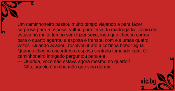 Um caminhoneiro passou muito tempo viajando e para fazer surpresa para a esposa, voltou para casa de madrugada. Como ele estava há muito tempo sem fazer sеxо, logo que chegou correu para o quarto agarrou a esposa e transou com ela umas quatro vezes. Quando acabou, resolveu ir até a cozinha beber água. Quando chegou encontrou a esposa sentada tomando café. O caminhoneiro intrigado perguntou para ela: