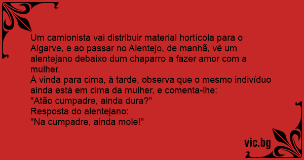 Um camionista vai distribuir material hortícola para o Algarve, e ao passar no Alentejo, de manhã, vê um alentejano debaixo dum chaparro a fazer amor com a mulher.