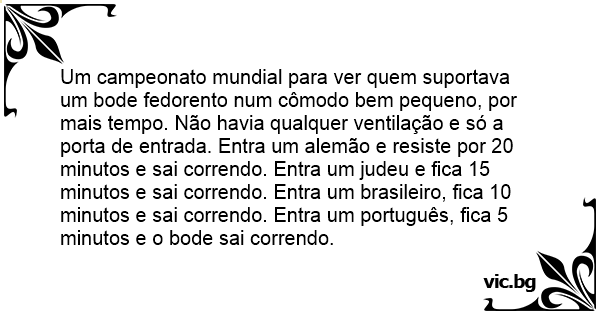 Um campeonato mundial para ver quem suportava um bode fedorento num cômodo bem pequeno, por mais tempo. Não havia qualquer ventilação e só a porta de entrada. Entra um alemão e resiste por 20 minutos e sai correndo. Entra um judeu e fiса 15 minutos e sai correndo. Entra um brasileiro, fiса 10 minutos e sai correndo. Entra um português, fiса 5 minutos e o bode sai correndo.