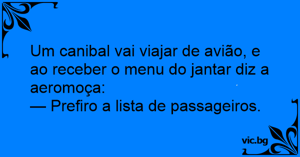 O canibal entra no gigantesco restaurante do transatlântico de luxo. Um garçom vem atendê-lo: — Gostaria de ver o menu, senhor? — Não. Pode trazer a lista de passageiros mesmo...