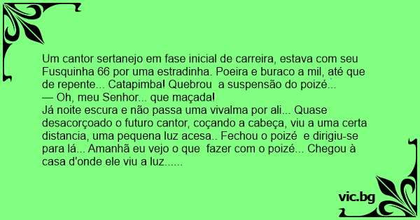 Um cantor sertanejo em fase inicial de carreira, estava com seu Fusquinha 66 por uma estradinha. Poeira e buraco a mil, até que de repente... Catapimba! Quebrou a suspensão do poizé...