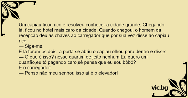 Um capiau ficou rico e resolveu conhecer a cidade grande. Chegando lá, ficou no hotel mais caro da cidade. Quando chegou, o homem da recepção deu as chaves ao carregador que por sua vez disse ao capiau rico:
