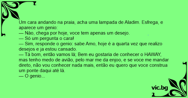 Um cara andando na praia, acha uma lampada de Aladim. Esfrega, e aparece um genio: