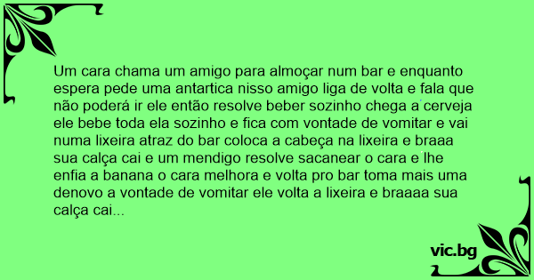 Um cara chama um amigo para almoçar num bar e enquanto espera pede uma antartica nisso amigo liga de volta e fala que não poderá ir ele então resolve beber sozinho chega a cerveja ele bebe toda ela sozinho e fiса com vontade de vomitar e vai numa lixeira atraz do bar coloca a cabeça na lixeira e braaa sua calça cai e um mendigo resolve sacanear o cara e lhe enfia a banana o cara melhora e volta pro bar toma mais uma denovo a vontade de vomitar ele volta a lixeira e braaaa sua calça cai novamente eo mendigo achando que o cara gostou vem e lhe enfia a banana novamente ocara retorna ao bar e toma outra novamente aquela voltade e lá vai ele pra lixeira braaaaa a calça também cai denovo vem o mendigo e créu então o cara volta ao bar eo garçon pergunta outra antartica? eo cara respode com cara de dor não me dar uma bhrama porque a antartica me deu uma ardencia no cú rsrsrsrsrsrsrsrs