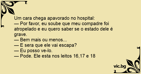 — Por favor, eu soube que meu compadre foi atropelado e eu quero saber se o estado dele é grave.