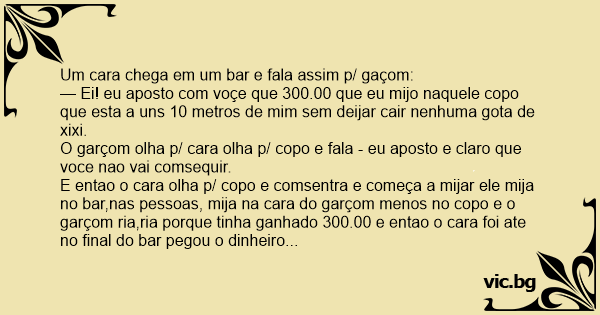 — Voce esta vendo aqueles 2 caras no final do bar eu apostei com eles 600,00 que eu mijaria no bar mijaria na cara do garçom e ele iria ficar tam comtente que ia começar a rir com cara de boco.............