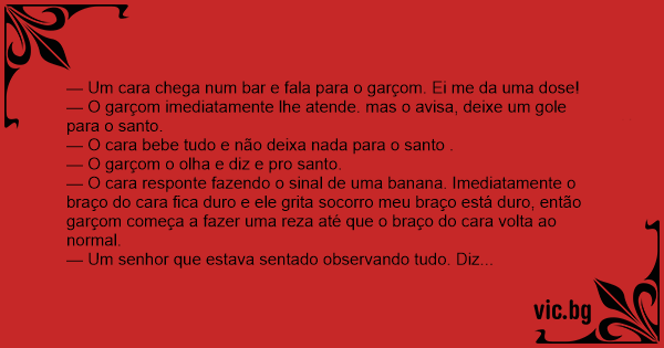 — O cara responte fazendo o sinal de uma banana. Imediatamente o braço do cara fiса durо e ele grita socorro meu braço está durо, então garçom começa a fazer uma reza até que o braço do cara volta ao normal.