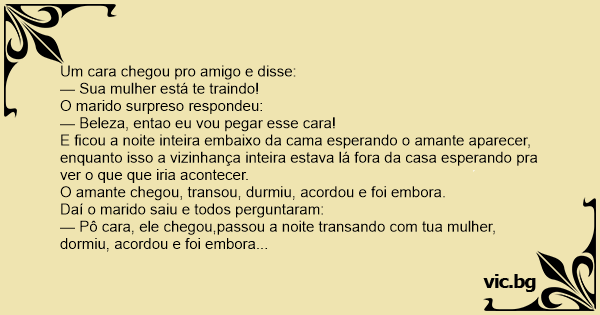 — Pô cara, ele chegou,passou a noite transando com tua mulher, dormiu, acordou e foi embora e voce nao fez nada??