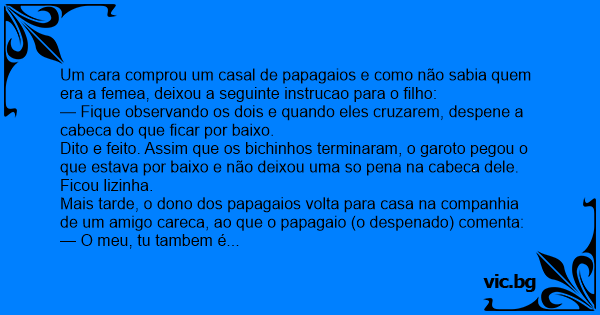 Um cara comprou um casal de papagaios e como não sabia quem era a femea, deixou a seguinte instrucao para o filho: — Fique observando os dois e quando eles cruzarem, despene a cabeca do que ficar por baixo. Dito e feito. Assim que os bichinhos terminaram, o garoto pegou o que estava por baixo e não deixou uma so pena na cabeca dele. Ficou lizinha. Mais tarde, o dono dos papagaios volta para casa na companhia de um amigo careca, ao que o papagaio (o despenado) comenta: — O meu, tu tambem é fresco?
