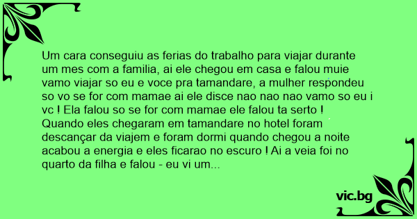 Um cara conseguiu as ferias do trabalho para viajar durante um mes com a familia, ai ele chegou em casa e falou muie vamo viajar so eu e voce pra tamandare, a mulher respondeu so vo se for com mamae ai ele disce nao nao nao vamo so eu i vc ! Ela falou so se for com mamae ele falou ta serto !