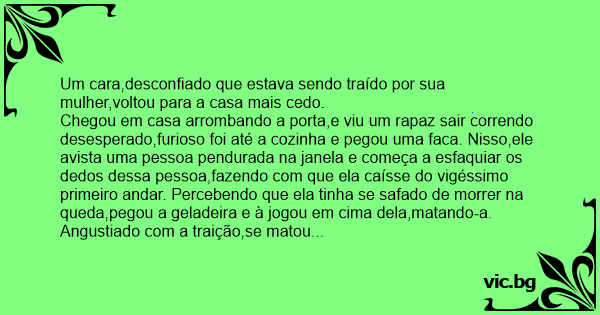 — Eu estava traindo um cara, quando vejo o cara entrando pela porta furioso,corri para a cozinha e entrei na geladeira,aí vem o cara e joga a geladeira prédio à baixo.