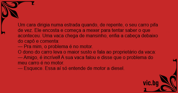 — Amigo, é incrível! A sua vаса falou e disse que o problema do meu carro é no motor.