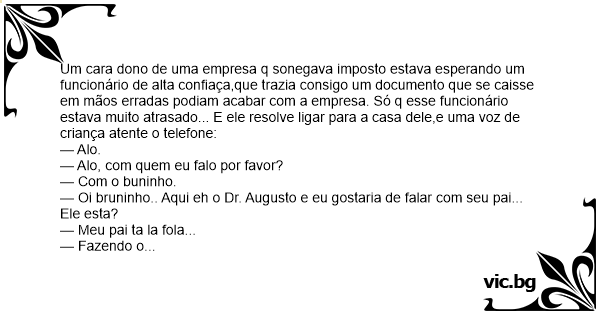 Um cara dono de uma empresa q sonegava imposto estava esperando um funcionário de alta confiaça,que trazia consigo um documento que se caisse em mãos erradas podiam acabar com a empresa. Só q esse funcionário estava muito atrasado... E ele resolve ligar para a casa dele,e uma voz de criança atente o telefone: