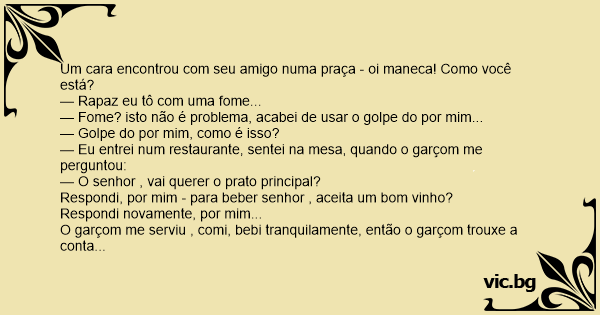 — Cara , acho que vou usar o golpe do por mim, não aguento mais de fome.