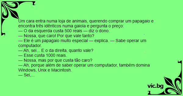Um garoto entra em uma loja de animais para comprar um papagaio se dirige ao balconista e fala: — Eu queria comprar um papagaio. — Tem aqueles 3 ali, fala o balconista apontanto para um canto. —...