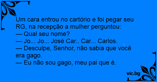 O sujeito vai receber a aposentadoria. — O seu nome, por favor? - pergunta o atendente. — Jo... jo... josé Ca... ca... carlos! — Desculpe-me, eu não sabia que o senhor era gago! — E não sou mesmo!...