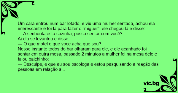 Um cara entrou num bar lotado, e viu uma mulher sentada, achou ela interessante e foi lá para fazer o "miguer", ele chegou lá e disse: