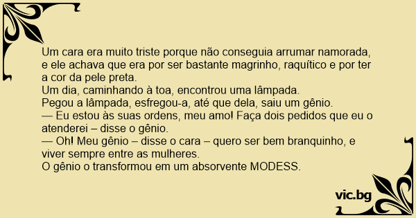 — Oh! Meu gênio – disse o cara – quero ser bem branquinho, e viver sempre entre as mulheres.