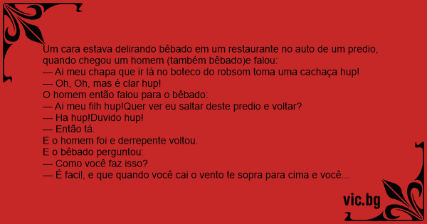 Um cara estava delirando bêbado em um restaurante no auto de um predio, quando chegou um homem (também bêbado)e falou: